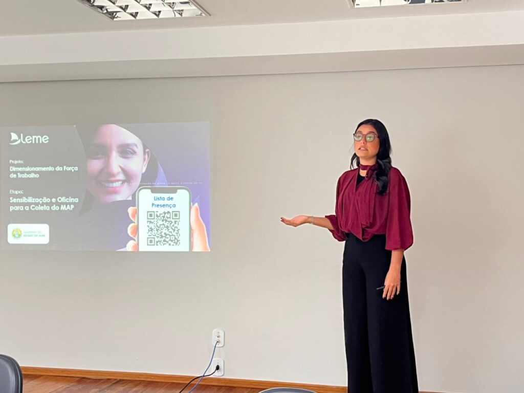 A oficina foi ministrada pela representante da empresa de consultoria em gestão de pessoas, Leme Consultoria, contratada para conduzir o projeto no Estado, Gabriela Tavares.